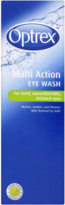 Optrex Multi Action Eye Wash washes, soothes and cleanses tired, irritated and uncomfortable eyes. The specially developed formula gently washes your eyes and provides sensitive and moisture replenishing relief for eyes irritated by dust, grit, smoke etc. It has also been designed to help tackle the effects of age and modern living, such as tired and uncomfortable eyes caused by contact lens wear, driving, computer use, manual work, smoky or polluted environments. It's a must-have for your first aid kit. Balanced at the natural pH level of tears and enriched with plant extracts, it gently helps to remove dust, make-up and other particles that can easily get trapped on the surface of your eye.