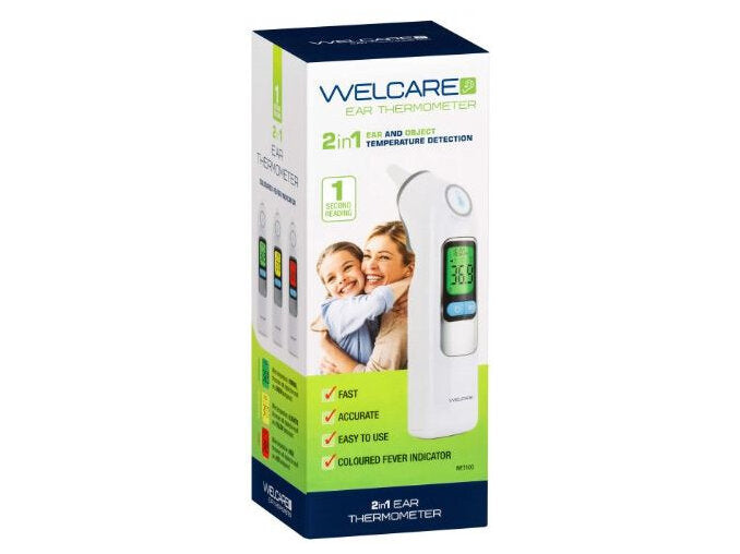 Get fast and accurate temperature readings in either ear or object mode with the Welcare Ear Thermometer. This easy to use thermometer features a backlit screen with colour fever indicators in green, yellow and red, so it can be easily used at night without waking a sleeping child. 30 reading memory helps you to keep track of temperature fluctuations over time.