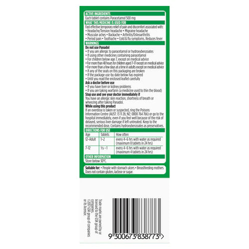 Do not take more than the stated dose. For adults this is usually up to a maximum of 8 tablets/capsules (500 mg) in 24 hours. Do not take other medicines that also contain paracetamol, unless you discuss this with a health professional.